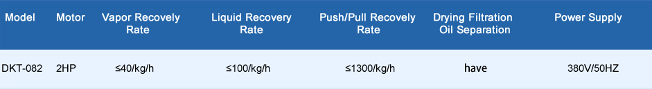 DKT-082 series after-sales vehicle refrigerant recovery machine for refrigeration after-sales service maintenance development and manufacture of new rapid refrigerant recovery equipment, the equipment can be placed in the trunk of the car, small size, light weight, easy to carry, suitable for the roof of the building, the basement, and other narrow space use, fast recovery speed, easy to operate.